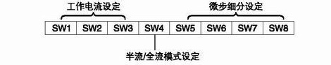 由SW1-SW3三个拨码开关来设定驱动器输出电流,其输出电流共有8档。具体输出电流的设定,请参见驱动器面板图说明