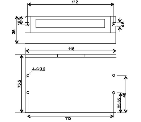驱动器的外形尺寸为:118x75.5x35mm,安装孔距为112mm。既可以卧式也可立式安装,建议采用立式安装。安装时,应使用其紧贴在金属柜上以利于散热。