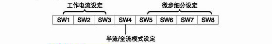 由SW1-SW3三个拨码开关来设定驱动器输出电流,其输出电流共有8档。具体输出电流的设定,请参见驱动器面板图说明
